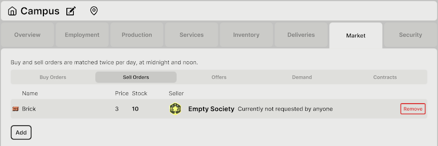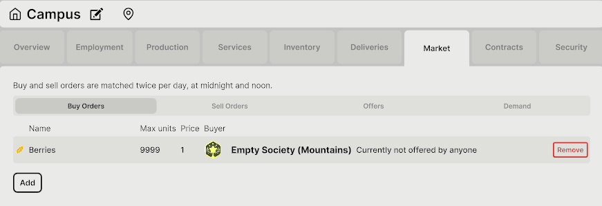 Food must reach the Campus for residents to eat. To automate the supply, simply create a Berries/Herbs buy order in the "Campus Market" tab. This ensures that whenever berries or herbs are available in the market, the Campus will automatically purchase them.
