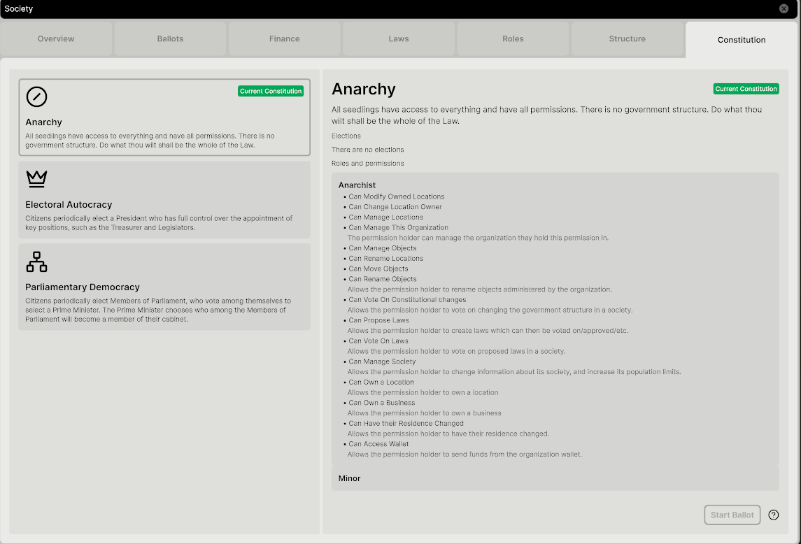 An anarchist constitution, meaning no governance—everyone has full permissions.