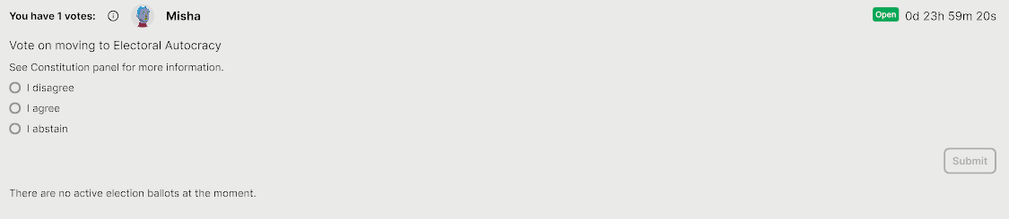 After clicking on “Start Ballot”, a voting process will start. In binary votes, if a candidate reaches a majority, the vote closes immediately, while multi-option voting takes a full 24 hours.