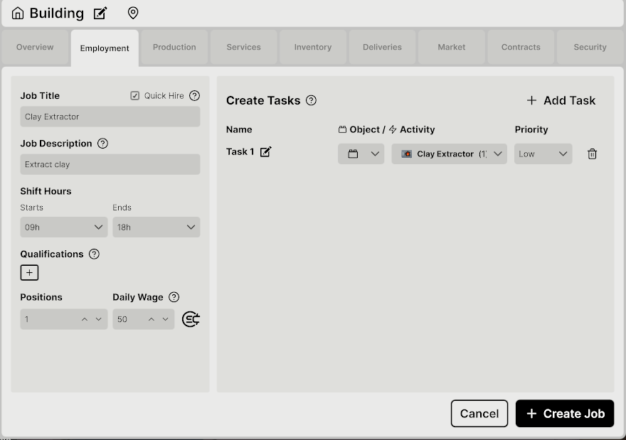 Jobs created in these buildings use society's money to pay wages. You will need to set up tasks within the job for the machines they will be using, as well as the inbox and outbox for that machine.