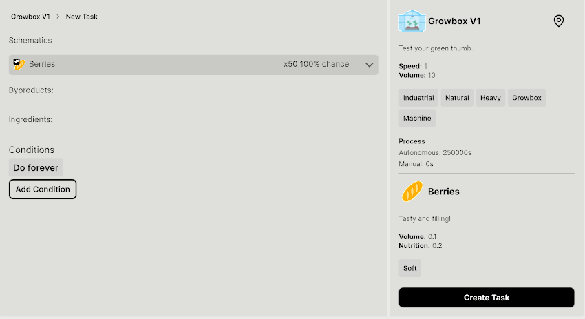 - Create a Berries/Herbs crafting task in the Growbox (Manage → Crafting → Growbox → New Task).
