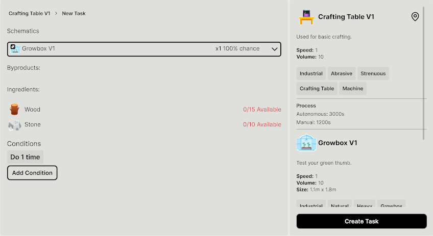 - Create a Growbox Crafting Task (Manage → Crafting → Crafting Table → New Task).