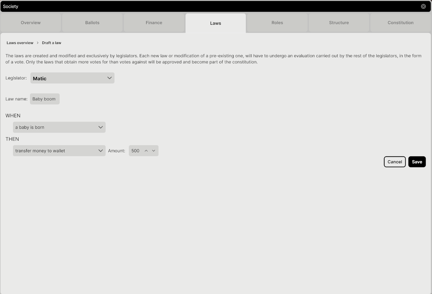 Once you've chosen the legislator and set the policy's components, give your law a name and hit 'Save' to open it up for voting.